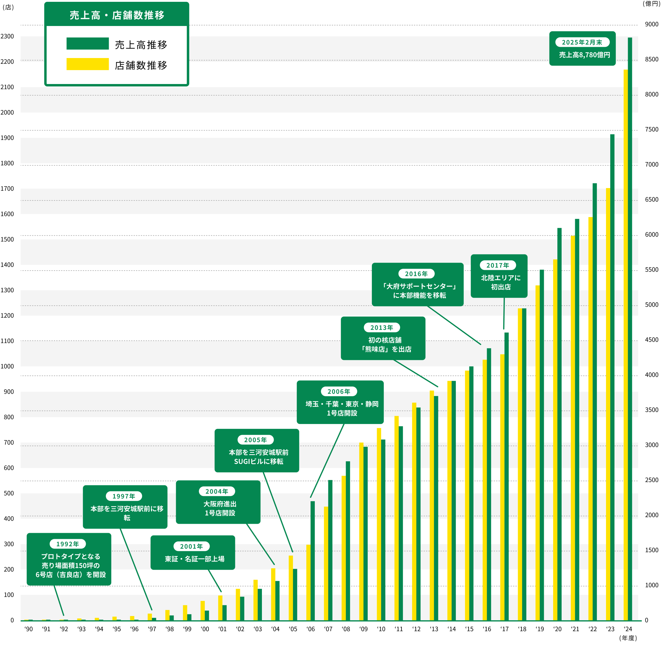 1992年のプロトタイプ店開設から2024年までの売上高と店舗数の推移を示す棒グラフ。売上高(緑)と店舗数(黄)が年々増加し、各年の主な出来事(本部移転、新業態出店、エリア拡大など)も併記されている。