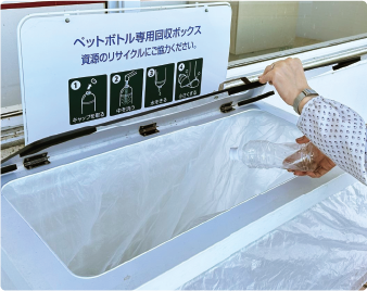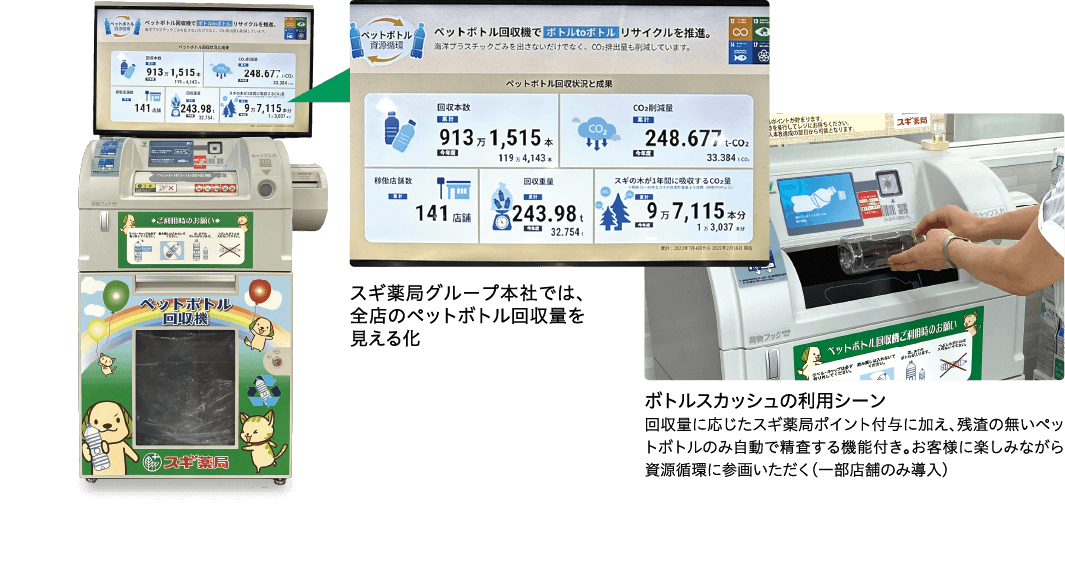 スギ薬局グループは、サプライチェーン企業の皆様と協同し、使用済みペットボトルを回収してペットボトルに再生する「ボトルtoボトル」水平リサイクルの取り組みを開始しました。2024年度は累計142店舗へボトルスカッシュを設置し、順次拡大中です。