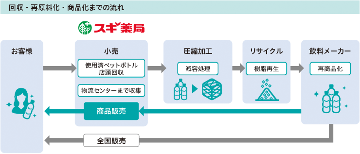 本取り組みでは、「スギ薬局」に新たにリサイクルボックスを設置し、ラベルとキャップを剥がし洗浄した状態の良質な使用済みペットボトルを回収することを目指します。店頭で回収した使用済みペットボトルは、「スギ薬局」店舗に商品を配送した帰りの便のトラックで店舗から「スギ薬局」物流センターまで運搬し、圧縮加工を行う会社が減容処理を行った後、リサイクラーにて樹脂再生を行います。その後、連携飲料メーカーが再生PETを使用した容器の飲料の製造を行います。