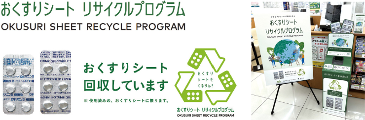 第一三共ヘルスケア株式会社が主催し、テラサイクルジャパン合同会社と共同で横浜市にて開始した、日本初となる使用済み「おくすりシート」(PTPシート)の生活者参加型リサイクルプログラムの実証実験に、スギ薬局グループの店舗が回収拠点として参画しています。