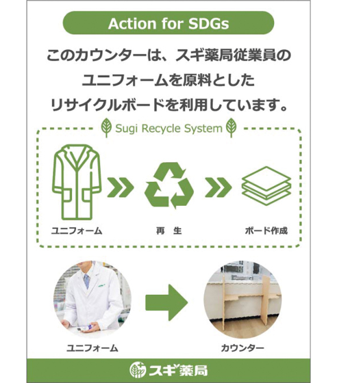 スギ薬局グループは、廃棄衣料品を原料としたサステナブルなボードであるPANEKOⓇを導入しました。店舗従業員の使用済みユニフォームを回収し、それをPANEKOⓇにし、店舗什器に再生しています。