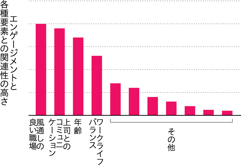 エンゲージメントとの関連性が高い順に、風通しの良い職場、上司とのコミュニケーション、年齢、ワークライフバランスと続き、その他の要素は関連性が低い傾向を示す棒グラフ。関連性の高さを比較できるように視覚化されている。(1のグラフ)