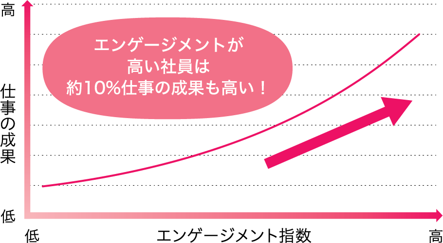 エンゲージメント指数が高いほど仕事の成果も高くなっており、エンゲージメントが高い社員は約10%仕事の成果も高い!(2のグラフ)